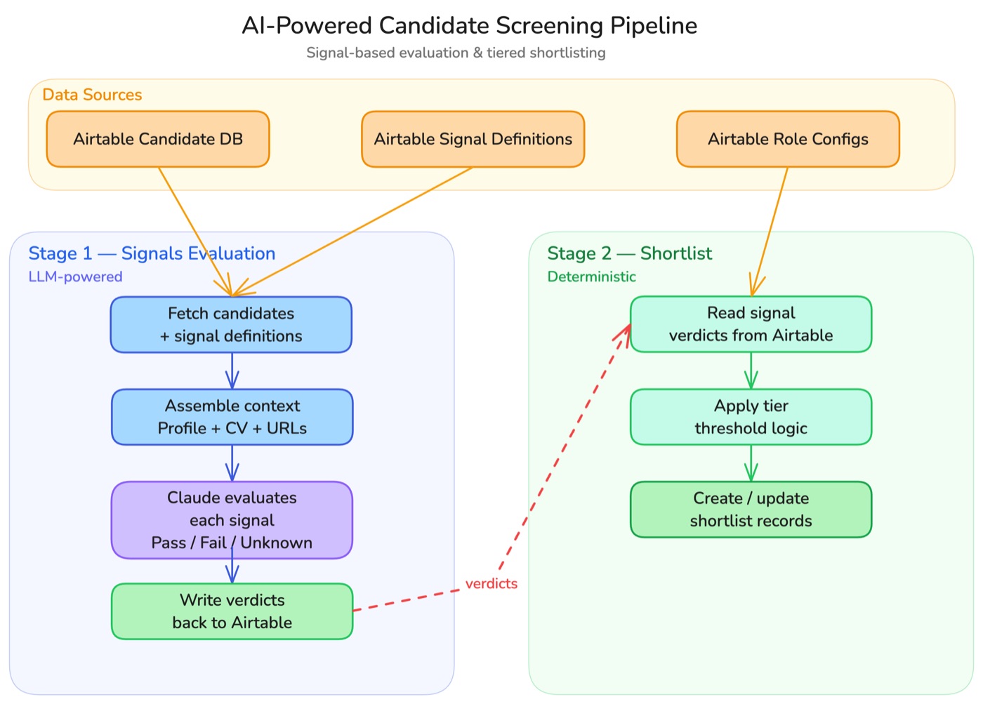 Automated two-stage screening pipeline: Claude evaluates candidates against configurable binary signals, then deterministic tier logic shortlists the top performers.