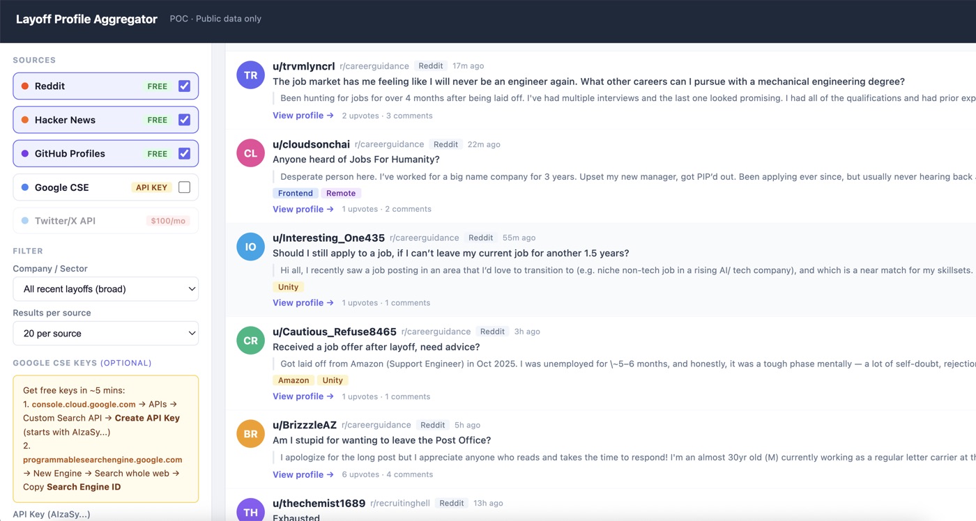 Monitors public signals across Reddit, GitHub, HackerNews, and Google CSE to rapidly surface experienced engineers entering the market during workforce transitions — feeding structured leads into downstream recruiting workflows.